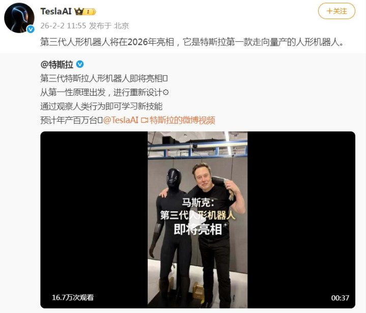 2月2日,特斯拉官方宣布,第三代特斯拉人形机器人即将亮相,预计年产百万台。